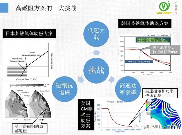其一是日本Osaka Prefecture大學提供的鐵氧體助磁方案,但該方案面臨磁鋼局部退磁問題,且功率較小和車用驅(qū)動不匹配。其二是韓國Sungkyunkwan 大學提供的高磁阻方案,但它的缺點是輸出轉(zhuǎn)矩低于普通IPM,且有效扭矩密度僅有25.5Nm/L,遠低于目前40~50m/L--普通車用圓線電機的水平。其三是美國GM公司正在開發(fā)的非稀土助磁方案,其扭矩密度和功率密度都達到車用電機水平,但高速時轉(zhuǎn)矩和功率衰減過快,無法滿足車輛高速行駛的要求。