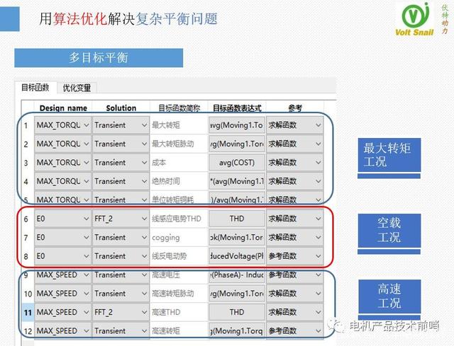 在設(shè)置目標時,我們選取了最大轉(zhuǎn)矩、空載、最高速度三個工況。其中最大轉(zhuǎn)矩工況以最大轉(zhuǎn)矩、轉(zhuǎn)矩脈動、成本、溫升時間、單位轉(zhuǎn)矩銅耗作為優(yōu)化目標,其實是即要監(jiān)控扭矩輸出能力和成本、還要監(jiān)控溫升和效率。防止出現(xiàn)高扭矩高損耗的不利情形;