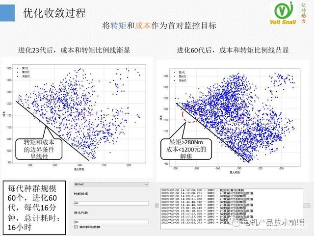 優(yōu)化的過程可以從下圖的界面中加以監(jiān)控。圖中的每一個點都代表一個方案,我們發(fā)現(xiàn)當優(yōu)化到了23代之后,轉(zhuǎn)矩和成本的邊界條件就已經(jīng)初步呈現(xiàn),這條線代表了優(yōu)化到極限時:轉(zhuǎn)矩和成本的對應(yīng)的關(guān)系。進化60代后,可以看到轉(zhuǎn)矩和成本呈現(xiàn)明顯的線性關(guān)系,而成本低于1200元(原IPM電機的80%),扭矩大于280Nm的點集,就是符合我們要求的解集。