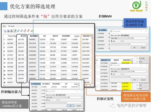 優(yōu)化完成后,能夠看到上千條解,我們施加了一系列限制條件,比如轉(zhuǎn)矩必須>280Nm,轉(zhuǎn)矩脈動必須<08%,來作多角度多方位的篩選。