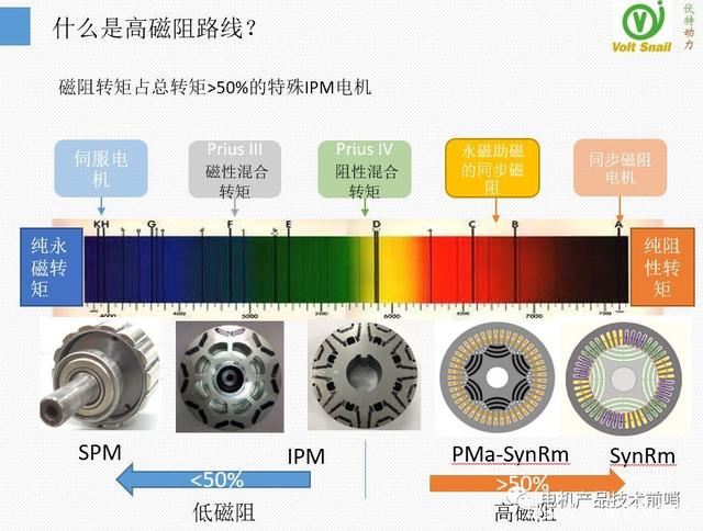 我們把視野放大,根據(jù)磁阻轉(zhuǎn)矩的比例高低制成一張“光譜”。在“光譜”的左端是“純永磁轉(zhuǎn)矩”,典型代表是“伺服應(yīng)用的SPM電機”, 另一端是“純磁阻轉(zhuǎn)矩”典型代表是“ABB標準工業(yè)同步磁阻電機”。而在這兩極之間還存在許多中間狀態(tài):比如磁阻轉(zhuǎn)矩比例在50%以內(nèi)Prius第三代和第四代的IPM電機。 而高磁阻路線,追求磁阻轉(zhuǎn)矩比例超過50%,在光譜中有兩種電機可選,除了純同步磁阻電機SynRm(磁阻轉(zhuǎn)矩100%)還有一種是永磁助磁同步磁阻電機PMa-SynRm。