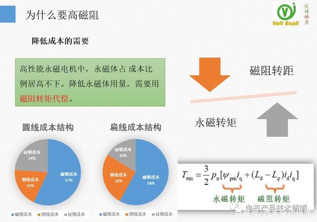走高磁阻技術(shù)路線的最大的動因,是能夠降低成本。同樣大小的轉(zhuǎn)矩,磁阻轉(zhuǎn)矩比例提高了,永磁轉(zhuǎn)矩就減少,相應(yīng)的永磁成本也降低了。如下圖所示,高性能驅(qū)動電機的有效成本構(gòu)成中,無論是圓線還是扁線,磁鋼的占比都是最高的。因此用磁阻轉(zhuǎn)矩去代償永磁轉(zhuǎn)矩是降低成本的有效措施。
