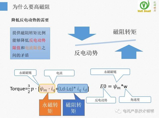 在上一期中我們已經(jīng)論述了提高磁阻轉(zhuǎn)矩能夠有效降低反電動勢的原因,文末有鏈接此處不再論述。簡單的理解純磁阻同步電機SynRm是沒有空載反電動勢的,而磁阻轉(zhuǎn)矩比例略低的永磁助磁同步磁阻電機PMa-SynRm的反電動勢也會較低,能夠滿足更低的反電動勢要求。
