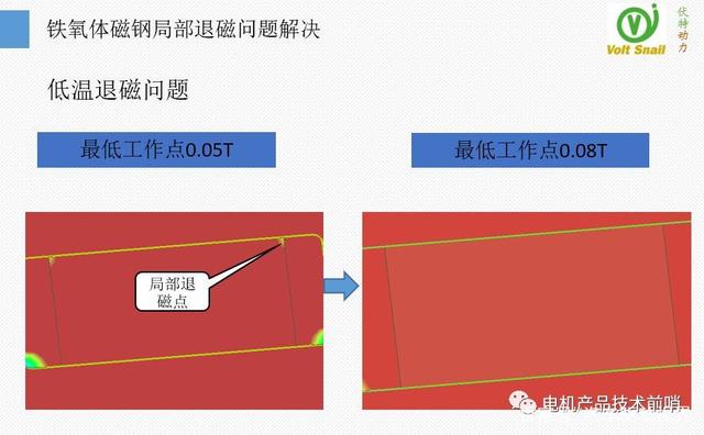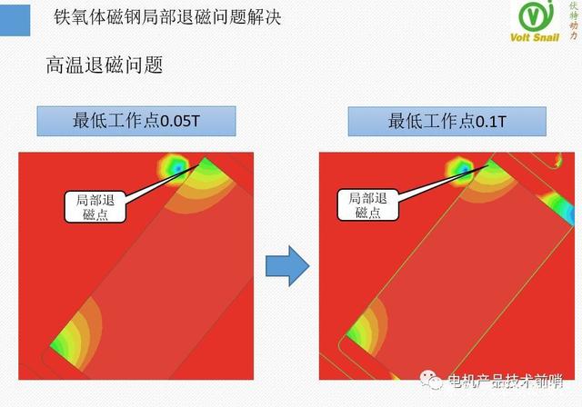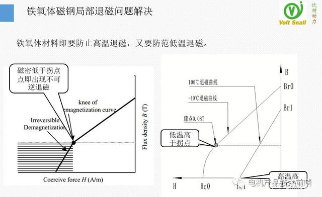 最后一個關(guān)鍵問題是磁鋼退磁問題,我們的方案用到了鐵氧體磁材,這是一種即低廉又特殊的磁性材料。